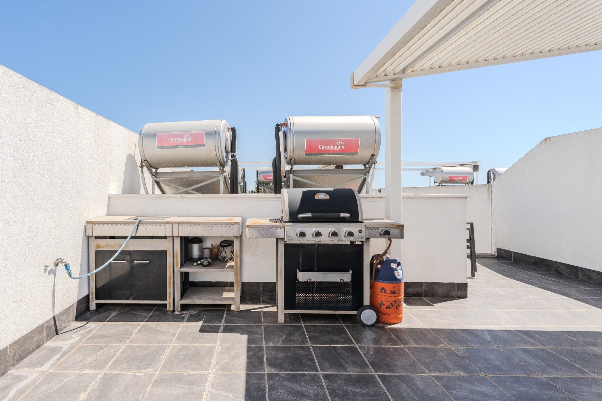 Estamos orgullosos de presentar este precioso ático de 2 dormitorios con una amplia azotea privada, ubicado a tan solo 600 metros de la playa en la tranquila y encantadora Torre de la Horadada. La vivienda destaca por su luminosidad y diseño funcional. Al entrar, el salón y la cocina se presentan como un espacio integrado y acogedor, perfectamente distribuido para aprovechar al máximo la luz natural. La cocina está equipada con todo lo necesario, pensada para ofrecer comodidad y estilo. Desde el salón se accede a la espectacular azotea privada, un espacio perfecto para relajarse, disfrutar del clima mediterráneo o compartir momentos al aire libre con amigos y familia. El ático cuenta con dos amplios dormitorios, ambos con armarios empotrados de puertas correderas que optimizan el espacio, ofreciendo almacenamiento práctico sin comprometer el diseño. El baño, completamente amueblado, presenta acabados modernos y funcionales, ideales para el día a día. La propiedad dispone de aire acondicionado frío/calor, asegurando el máximo confort en cualquier estación del año. Se vende completamente amueblada, lista para entrar a vivir, lo que la convierte en una opción perfecta tanto para vivienda permanente como para casa de vacaciones. En las zonas comunes, podrás disfrutar de una gran piscina rodeada de áreas verdes donde relajarte bajo el sol, así como una pista de pádel para los más activos. Todo está diseñado para crear un entorno tranquilo y agradable, ideal para toda la familia. La ubicación de este ático es inmejorable. Torre de la Horadada ofrece un ambiente relajado con una amplia oferta de servicios como farmacias, supermercados, parques y áreas infantiles. Además, cuenta con un puerto deportivo con restaurantes, bares de tapas y cafeterías que dan vida a la zona durante todo el año. Sus playas de bandera azul, de arena fina y aguas cristalinas, están a pocos pasos de distancia, ofreciendo un entorno privilegiado para disfrutar del mar. A pocos minutos en coche se encuentran reconocidos campos de golf como Lo Romero, Roda Golf y La Serena, así como centros comerciales como "Dos Mares" y "La Zenia Boulevard", donde encontrarás una amplia oferta de tiendas y restaurantes. La conexión con ciudades cercanas como Torrevieja, Alicante y Murcia es excelente, con autobuses frecuentes y acceso rápido por carretera.