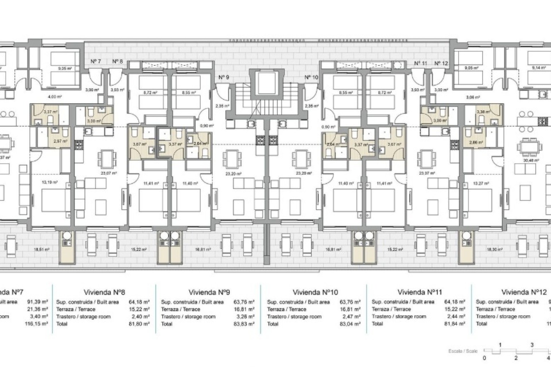 Los exteriores han sido pensados para maximizar el disfrute del clima mediterráneo. Las terrazas son perfectas para comidas al aire libre o momentos de descanso bajo el sol, mientras que los soláriums de los áticos ofrecen vistas panorámicas excepcionales.