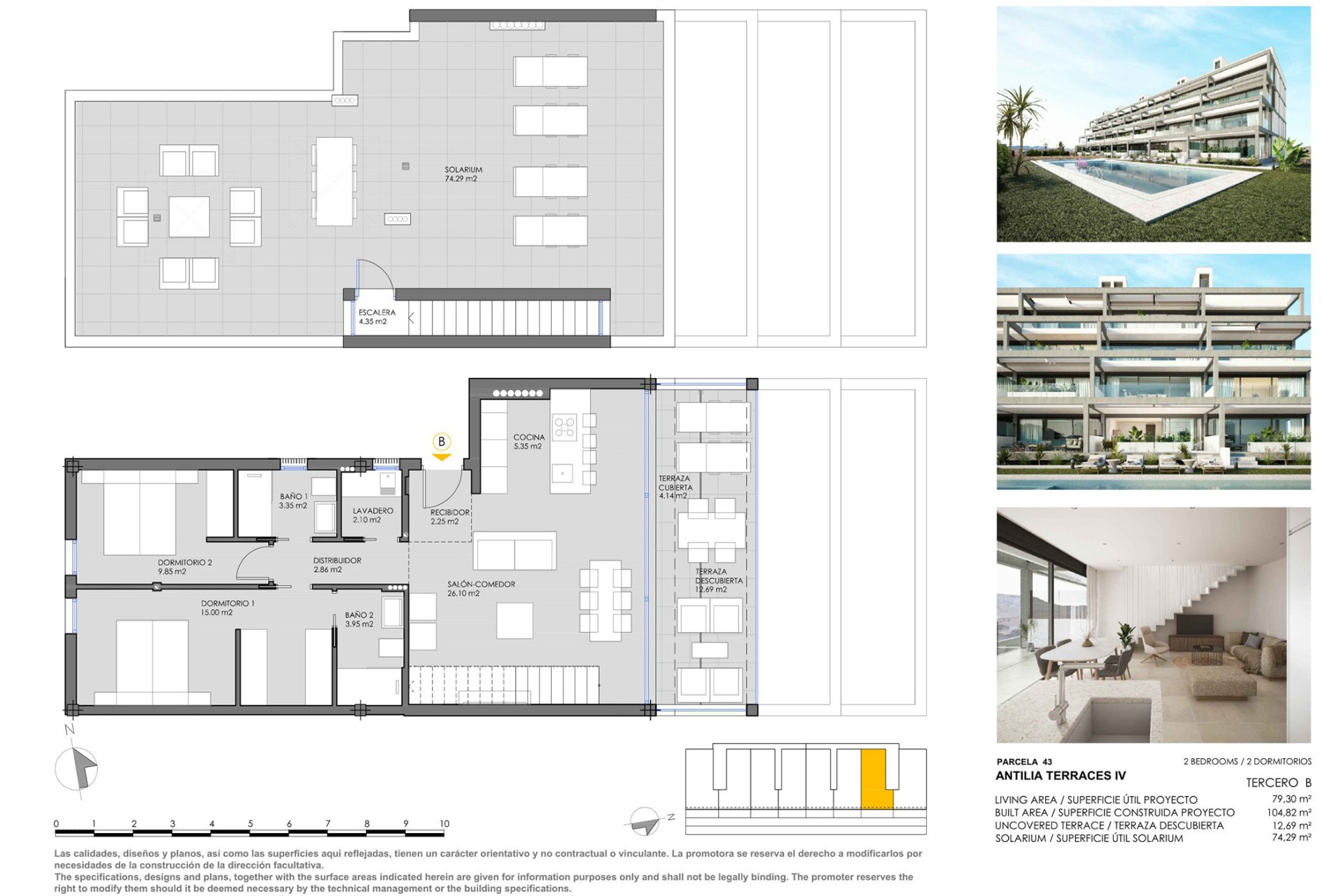Nuosavybių interjeras yra suprojektuotas taip, kad pasiūlytų modernią ir funkcionalią aplinką. Keraminės grindys suteikia elegantišką išvaizdą ir yra lengvai prižiūrimos, o integruoti prietaisai palengvina kasdienį gyvenimą. Įmontuotos spintos optimizuoja saugojimo erdvę, palaikant tvarką ir organizaciją namuose. Išdėstymo galimybės apima 2 arba 3 miegamuosius ir 2 vonios kambarius, prisitaikant prie įvairių šeimos poreikių. Terasų ir, kai kuriais atvejais, soliariumo įtraukimas plečia gyvenamąją erdvę, leidžiant mėgautis Viduržemio jūros klimatu iš namų patogumo.
