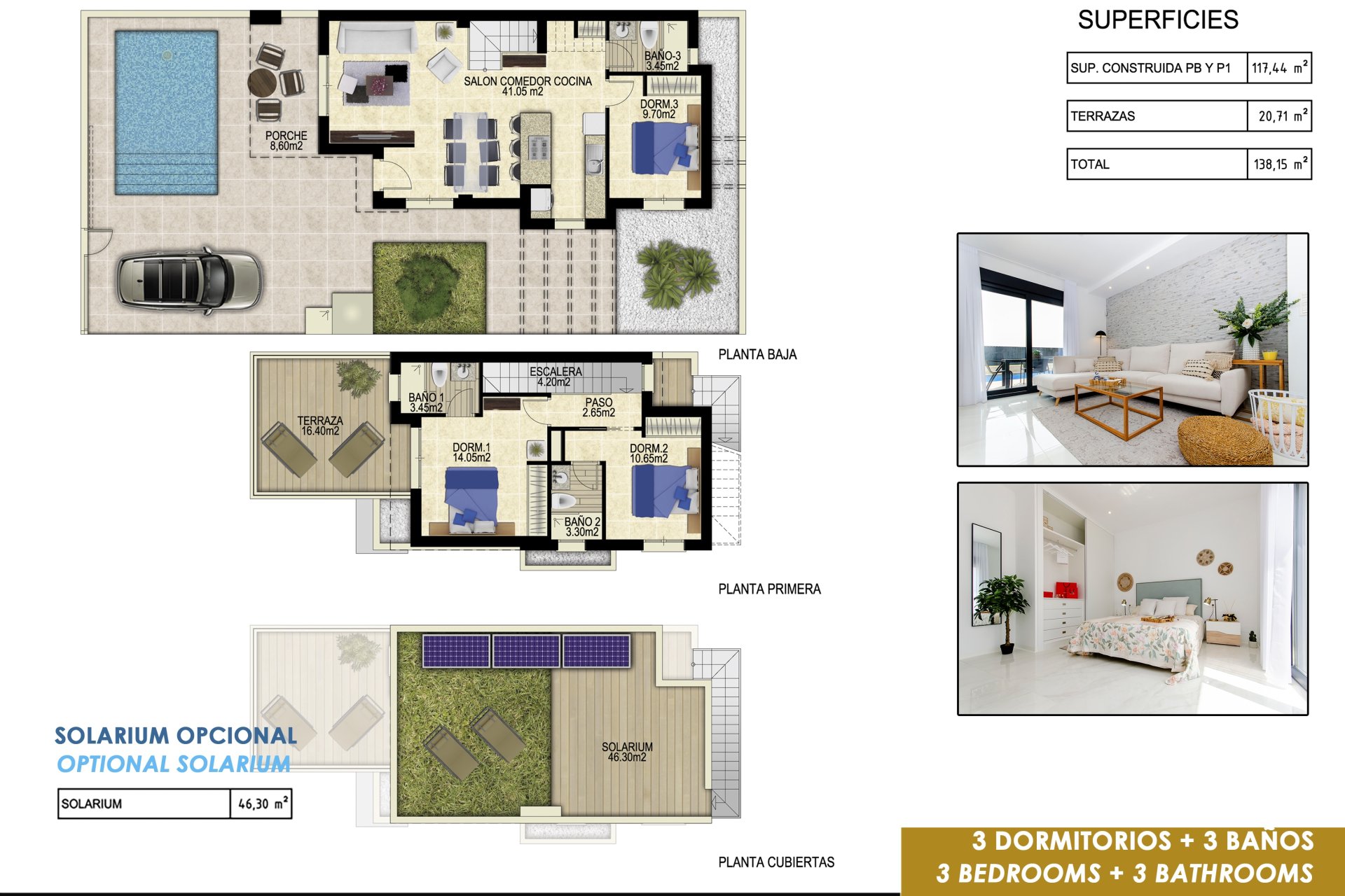 3Ligger i den sjarmerende byen Orihuela, tilbyr dette boligkomplekset 39 frittstående boliger som utmerker seg med sitt moderne og funksjonelle design. Disse eiendommene er ment for de som søker et hjem i et rolig miljø, men med alle bekvemmeligheter innen rekkevidde. Nærheten til en golfbane, bare 0,85 km unna, gir en ekstra attraksjon for golfentusiaster. Boligene har tre soverom og tre bad, som gir god plass og komfort for hele familien. Muligheten til å velge et valgfritt solarium lar beboerne nyte det middelhavske klimaet til det fulle.