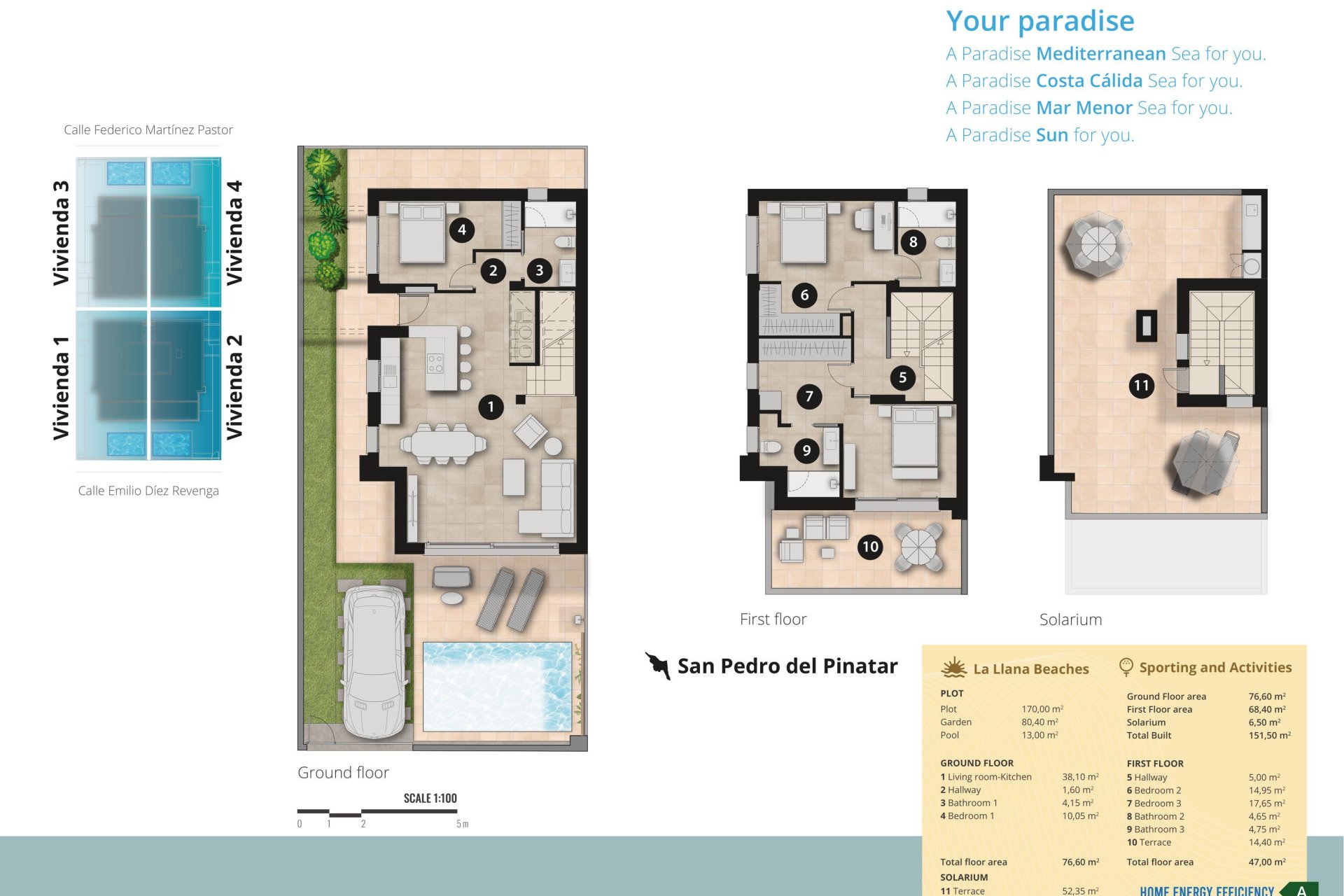 3Ligger i den sjarmerende byen San Pedro del Pinatar, tilbyr disse frittstående boligene et ideelt miljø for de som søker nærhet til havet, kun 1 km unna. Med totalt fire tilgjengelige eiendommer, er hver designet for å gi maksimal komfort og funksjonalitet. Boligtypen er "Frittstående", som garanterer privatliv og eksklusivitet i et privilegert miljø.
