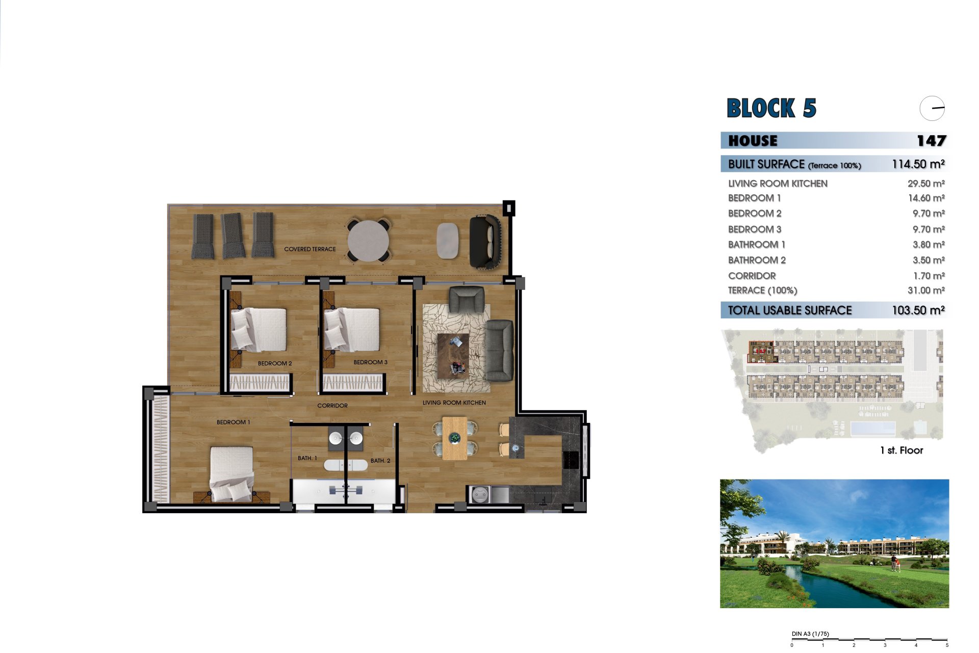 Interiøret i boligene er nøye designet for å tilby komfort og modernitet. Gulv i porselensfliser gir et elegant preg og er lett å vedlikeholde. Boligene er utstyrt med moderne hvitevarer, som sikrer at kjøkkenet er både funksjonelt og stilig. Elektriske persienner og videointercom gir et ekstra nivå av komfort og sikkerhet. Innebygde garderober på soverommene gir rikelig med lagringsplass, og holder områdene ryddige og organiserte. Fordelingsalternativene inkluderer boliger med 2 og 3 soverom, alle med 2 bad, som sikrer tilstrekkelig plass for familier av forskjellige størrelser.
