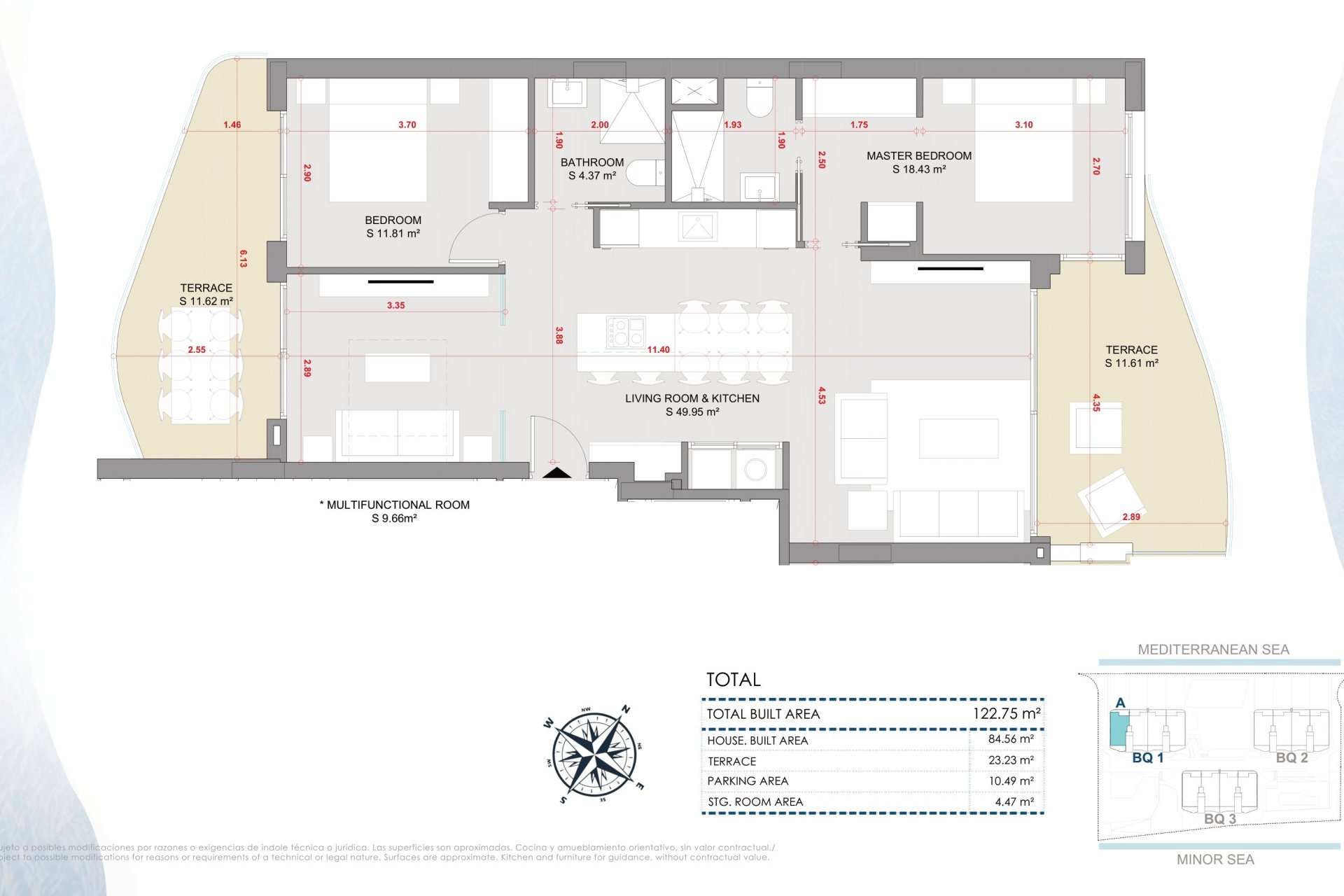 Utendørsområdene til denne boligen er designet for å maksimere nytelsen av det naturlige miljøet. Hver eiendom har en privat hage, ideell for å slappe av utendørs. De romslige terrassene gir ekstra plass til å nyte havutsikten og middelhavsklimaet. I tillegg inkluderer noen typologier et solarium, som gir et eksklusivt område for soling eller rolige stunder. Beliggenheten på første linje ved stranden sikrer at beboerne kan nyte sjøbrisen og uavbrutt utsikt over horisonten.
