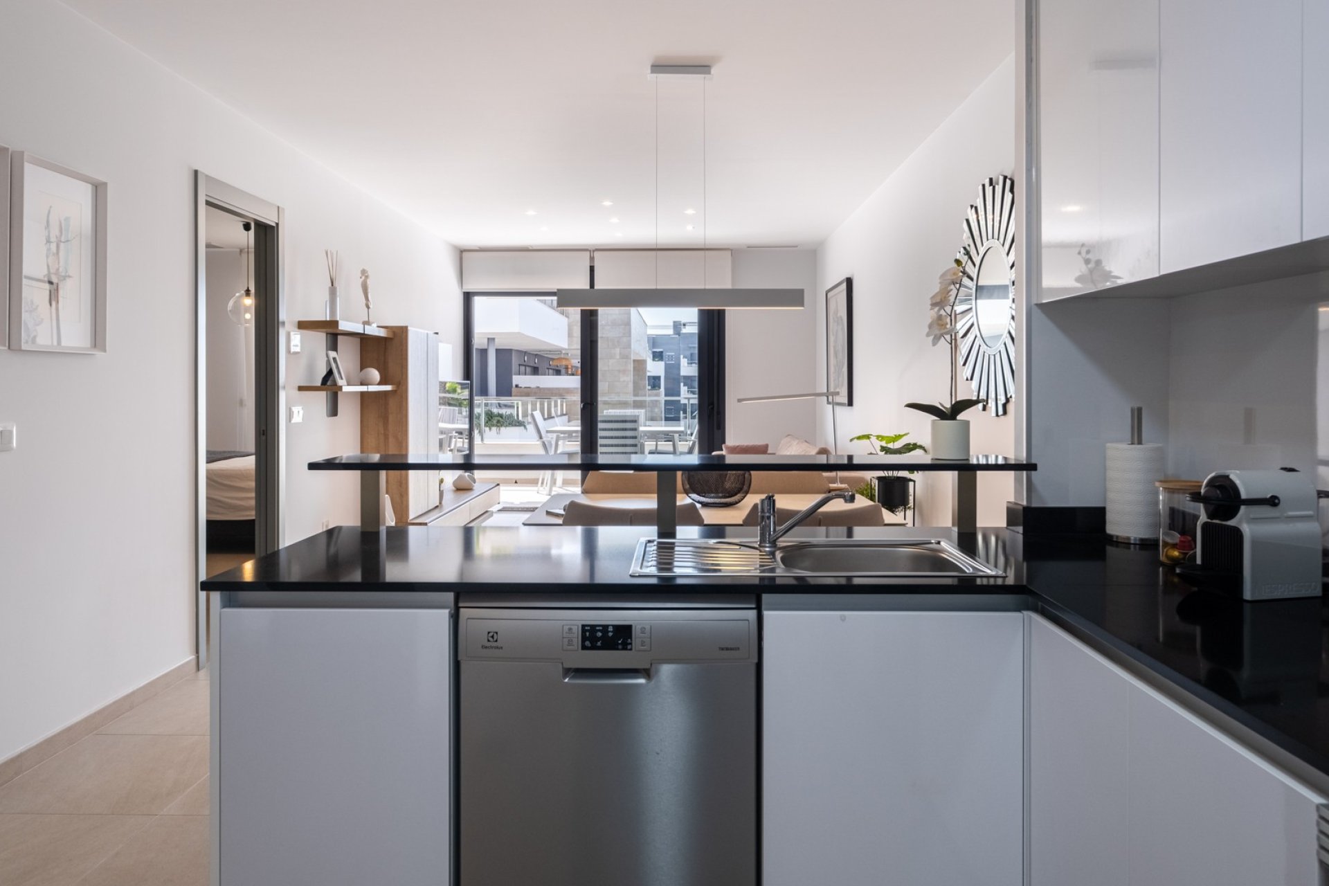Apartament zaprojektowany został z myślą o funkcjonalności i elegancji. Posiada jasny, otwarty salon połączony z nowoczesną, w pełni wyposażoną kuchnią ze stylowym barem—idealnym miejscem do spotkań rodzinnych i towarzyskich. Duże okna zapewniają obfite naturalne światło przez cały dzień, podkreślając ciepły klimat śródziemnomorski.