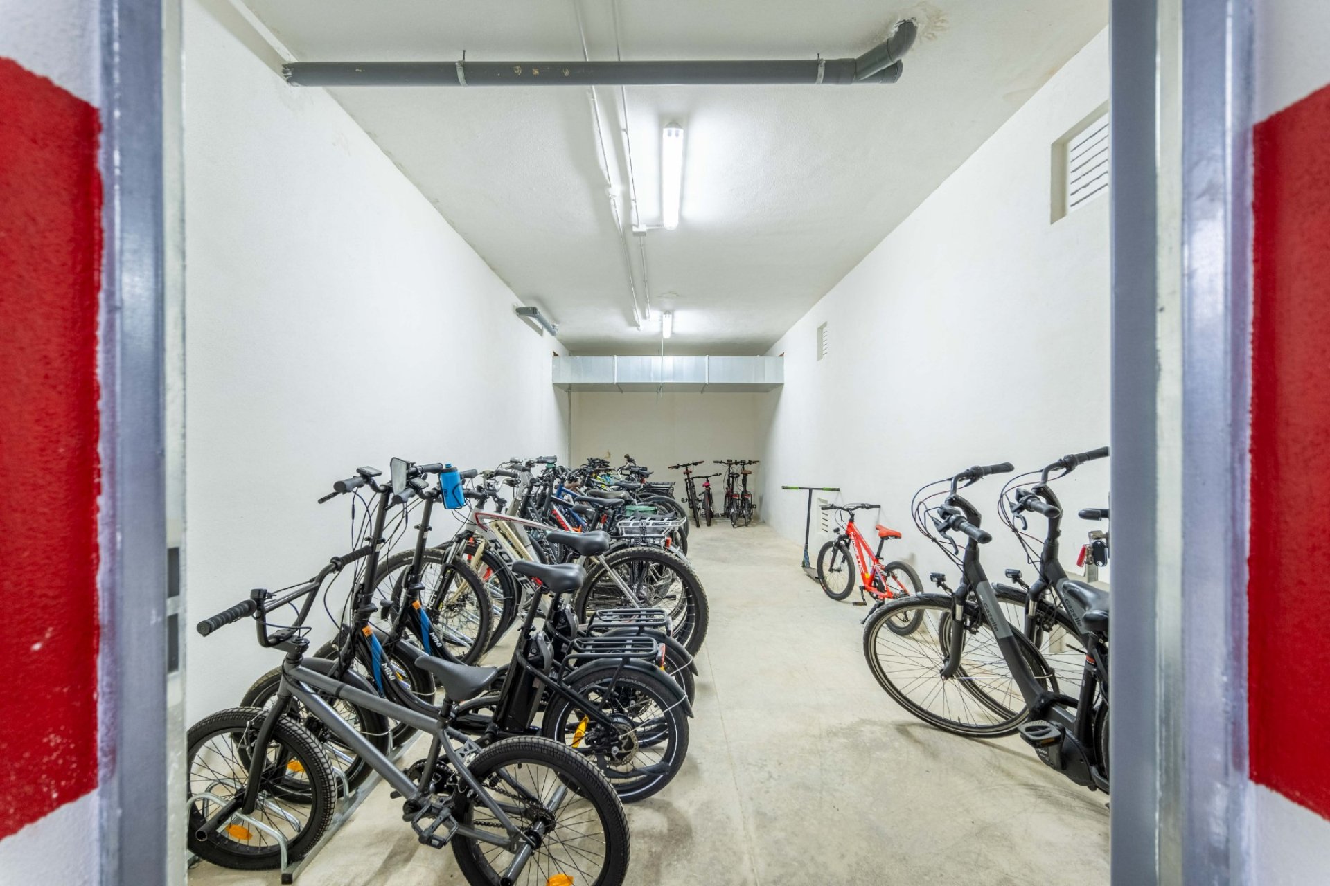 Apartament wyposażony jest w ogrzewanie podłogowe oraz elektryczne rolety na tarasie, pozwalające na korzystanie z przestrzeni zewnętrznej w każdym sezonie. Praktyczne udogodnienia obejmują bezpieczne miejsce parkingowe w garażu podziemnym, wspólną przestrzeń na rowery oraz bezpośredni dostęp windą z garażu do mieszkania, dla dodatkowej wygody.