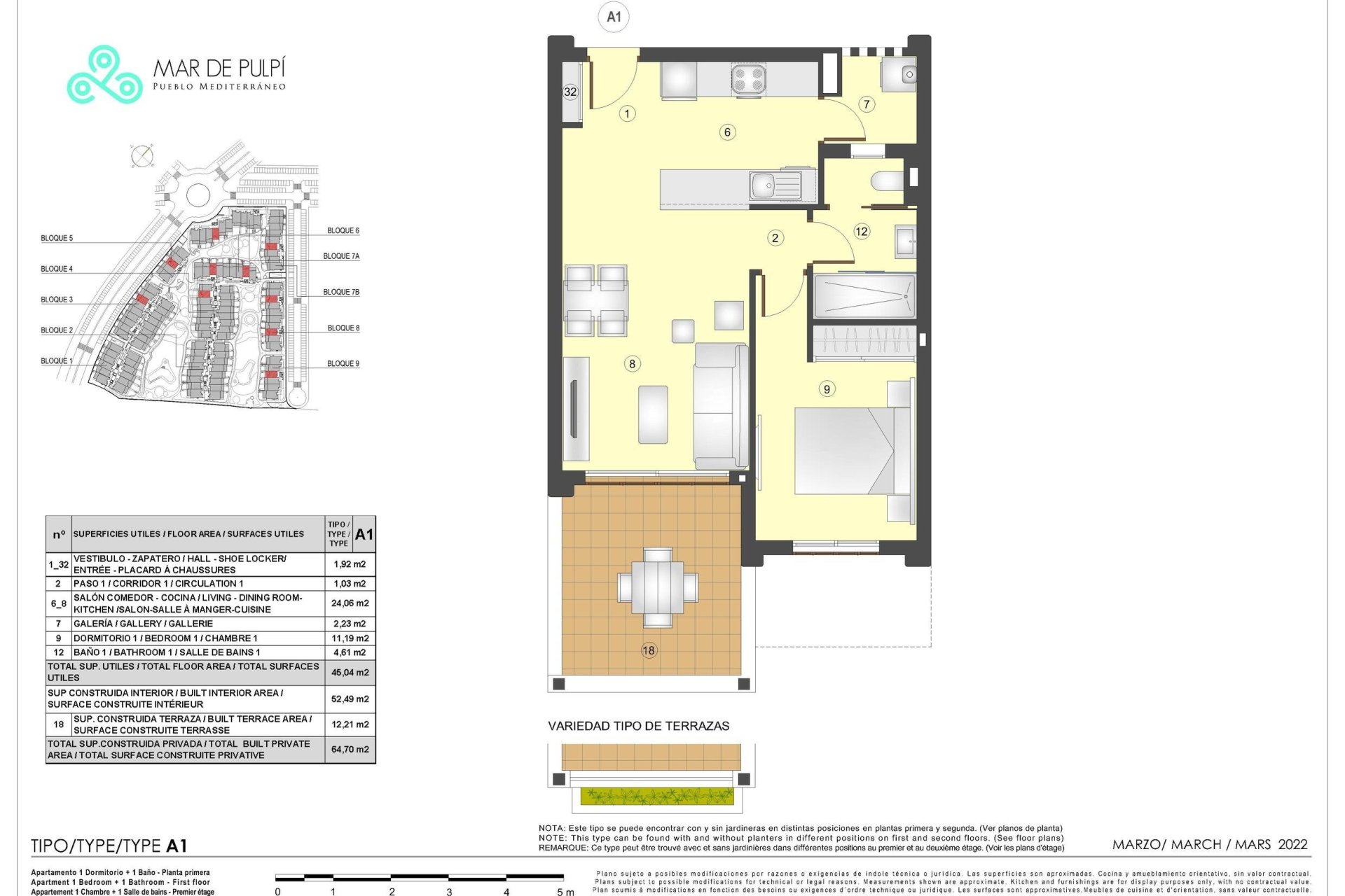 TakPołożony w urokliwej miejscowości Pulpí, ten kompleks mieszkaniowy oferuje różnorodne opcje mieszkaniowe, które odpowiadają różnym potrzebom i stylom życia. Z łączną liczbą 157 nieruchomości, mieszkańcy mogą wybierać spośród apartamentów, bungalowów i penthouse'ów, z których każdy zaprojektowany jest tak, aby maksymalizować komfort i funkcjonalność. Bliskość morza, zaledwie 1 km, pozwala cieszyć się widokiem na morze z wielu mieszkań, tworząc atmosferę spokoju i relaksu. Układy obejmują mieszkania z 1, 2 i 3 sypialniami, z 1 lub 2 łazienkami, co zapewnia elastyczność dla rodzin o różnej wielkości. Strategiczne położenie w Pulpí gwarantuje łatwy dostęp do lokalnych usług i atrakcji rekreacyjnych, co czyni ten kompleks mieszkaniowy idealnym wyborem dla tych, którzy szukają równowagi między wygodą a jakością życia.