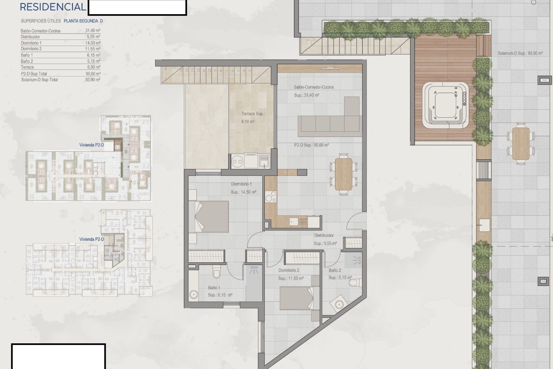 Na zewnątrz zaprojektowano przestrzenie, aby maksymalnie wykorzystać przyjemność z klimatu śródziemnomorskiego. Tarasy i solaria zapewniają idealną przestrzeń do relaksu na świeżym powietrzu i cieszenia się widokami otaczającymi kompleks. Te przestrzenie zewnętrzne są idealne do wypoczynku i relaksu, pozwalając w pełni wykorzystać słoneczny klimat regionu.