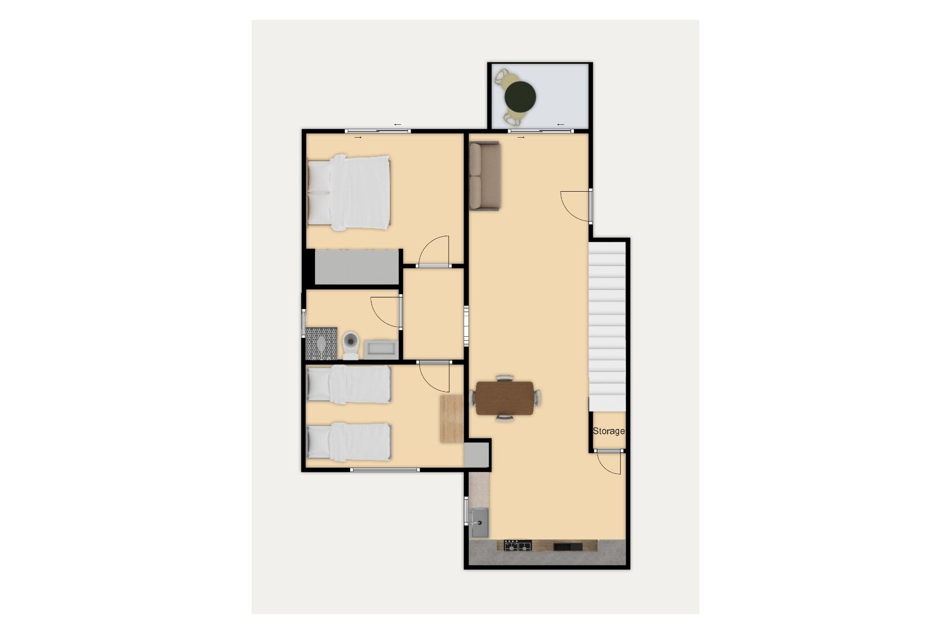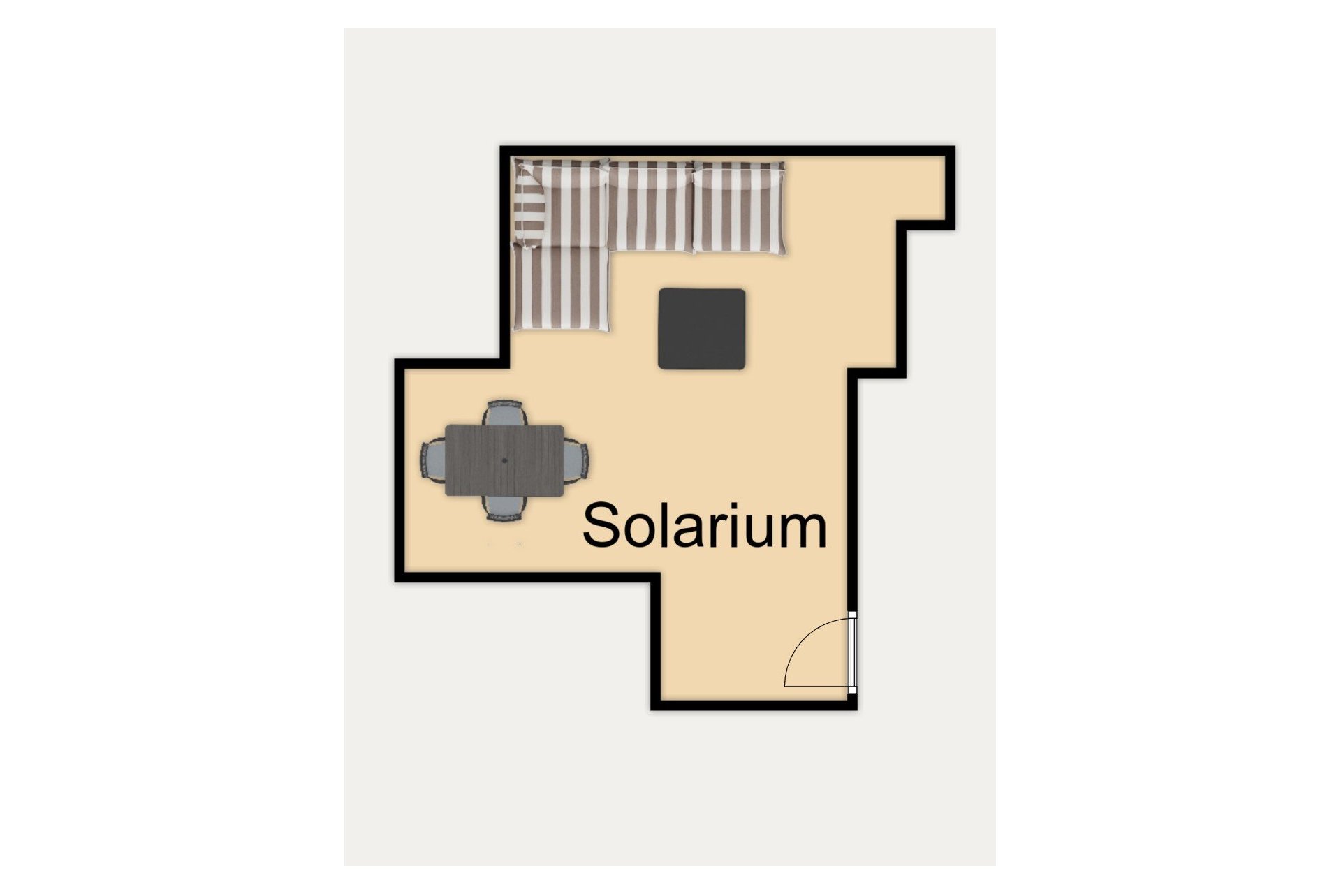The living room opens onto a cosy private balcony. From here, an internal staircase leads to a spacious private solarium with open views of the Mediterranean Sea and the communal swimming pool. The rooftop terrace is fully equipped with an awning, outdoor furniture and a BBQ area — ideal for relaxing or entertaining all year round.