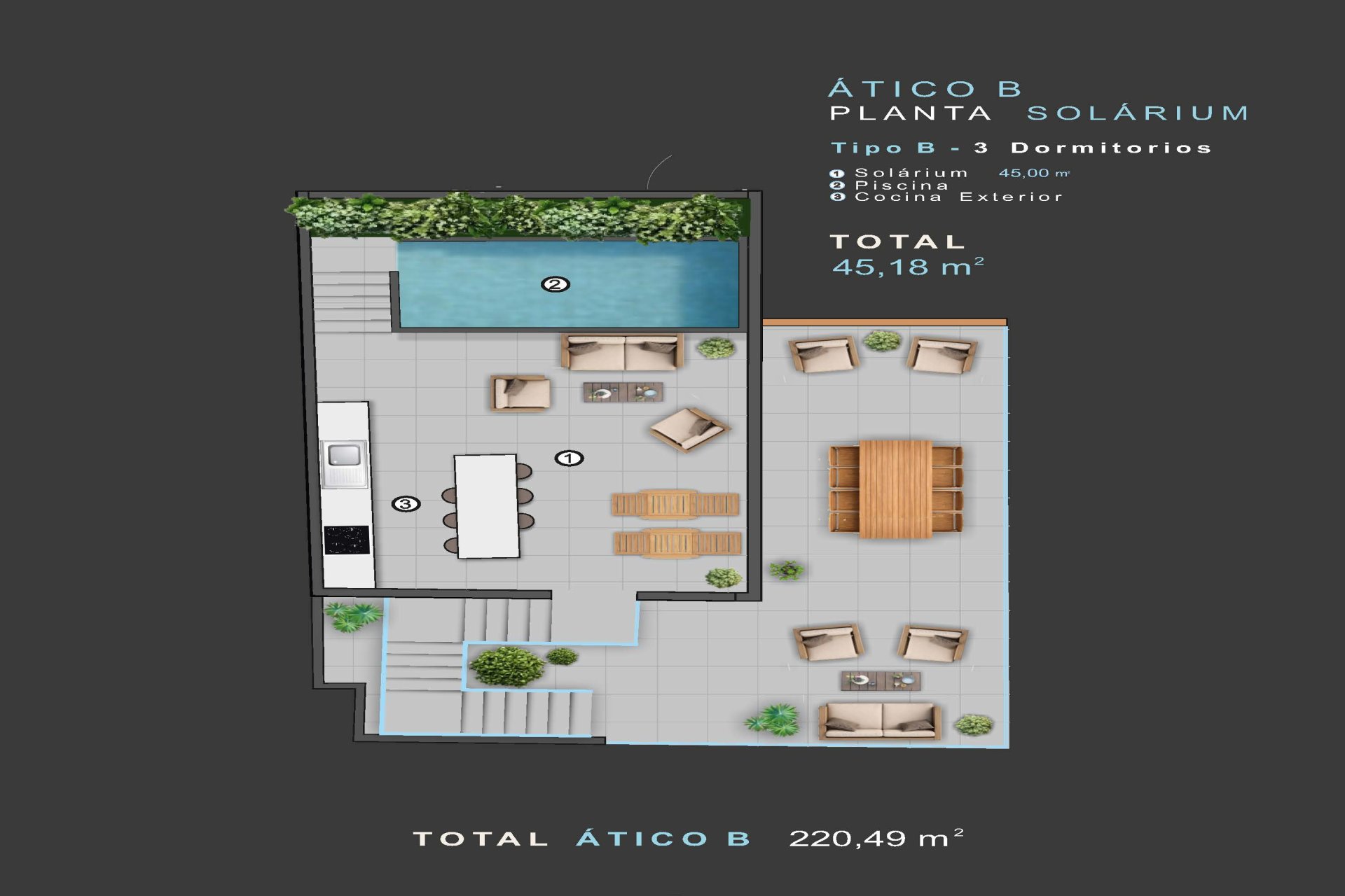 The private solarium is an additional space to enjoy the sun of the Costa Blanca. This place is perfect for creating a relaxing corner or an area to share with friends and family. The private pool ensures unmatched moments of fun and relaxation, being one of the main attractions of these properties.