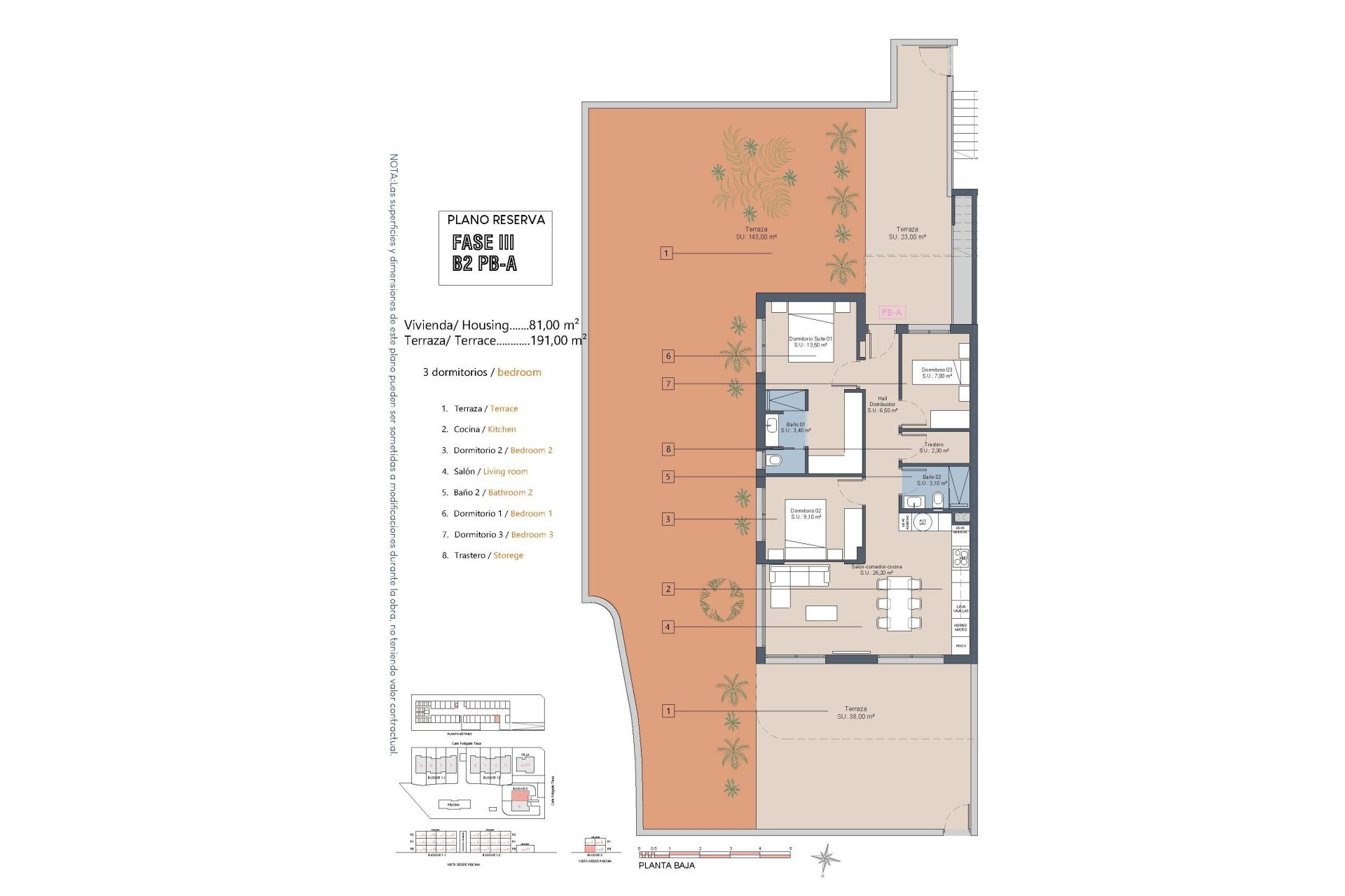 The interior of the bungalows is carefully designed to offer comfort and style. With three bedrooms and two bathrooms, each property is equipped to meet the needs of a modern family. The porcelain tile floors add a touch of elegance and are easy to maintain. The kitchen is equipped with appliances, facilitating daily life from day one. Built-in wardrobes in the bedrooms provide efficient storage, while the pre-installation of air conditioning ensures the home stays cool during the warmer months. The internal layout is designed to optimize space and functionality.