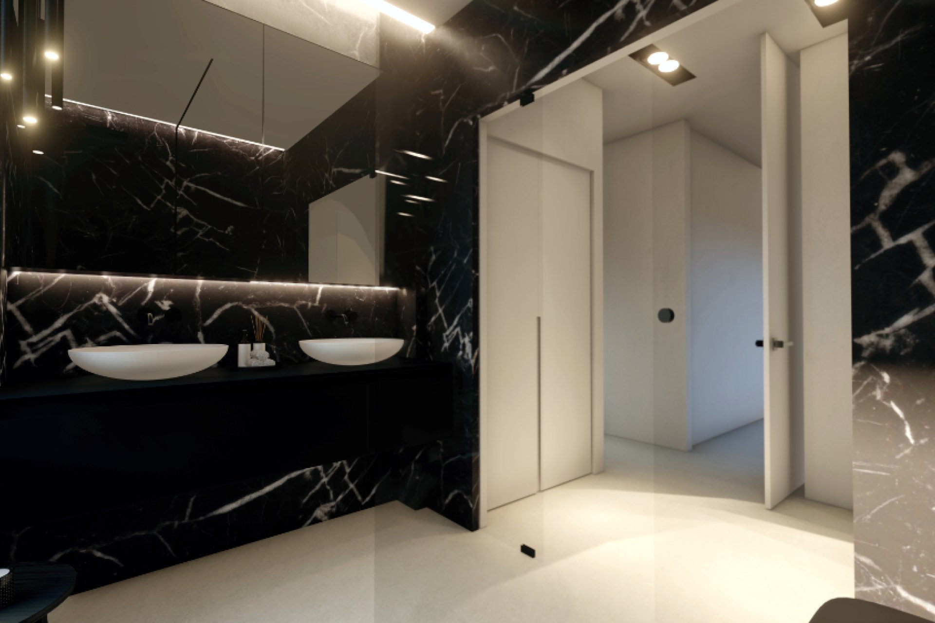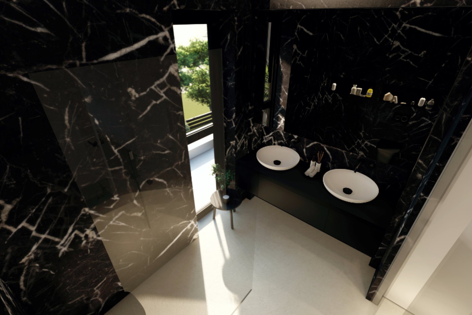 Bathroom tiling in extra large format in rectified porcelain material.