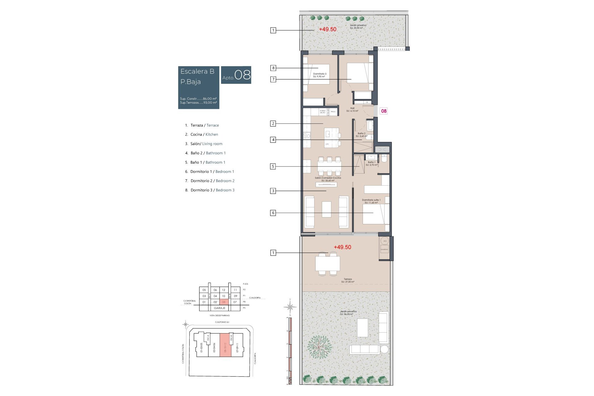 Inside, each property stands out with a contemporary and functional design. The apartments, ground floors, and penthouses feature three bedrooms and two bathrooms. This design offers a spacious and well-distributed area for the whole family, ensuring comfort in every corner.