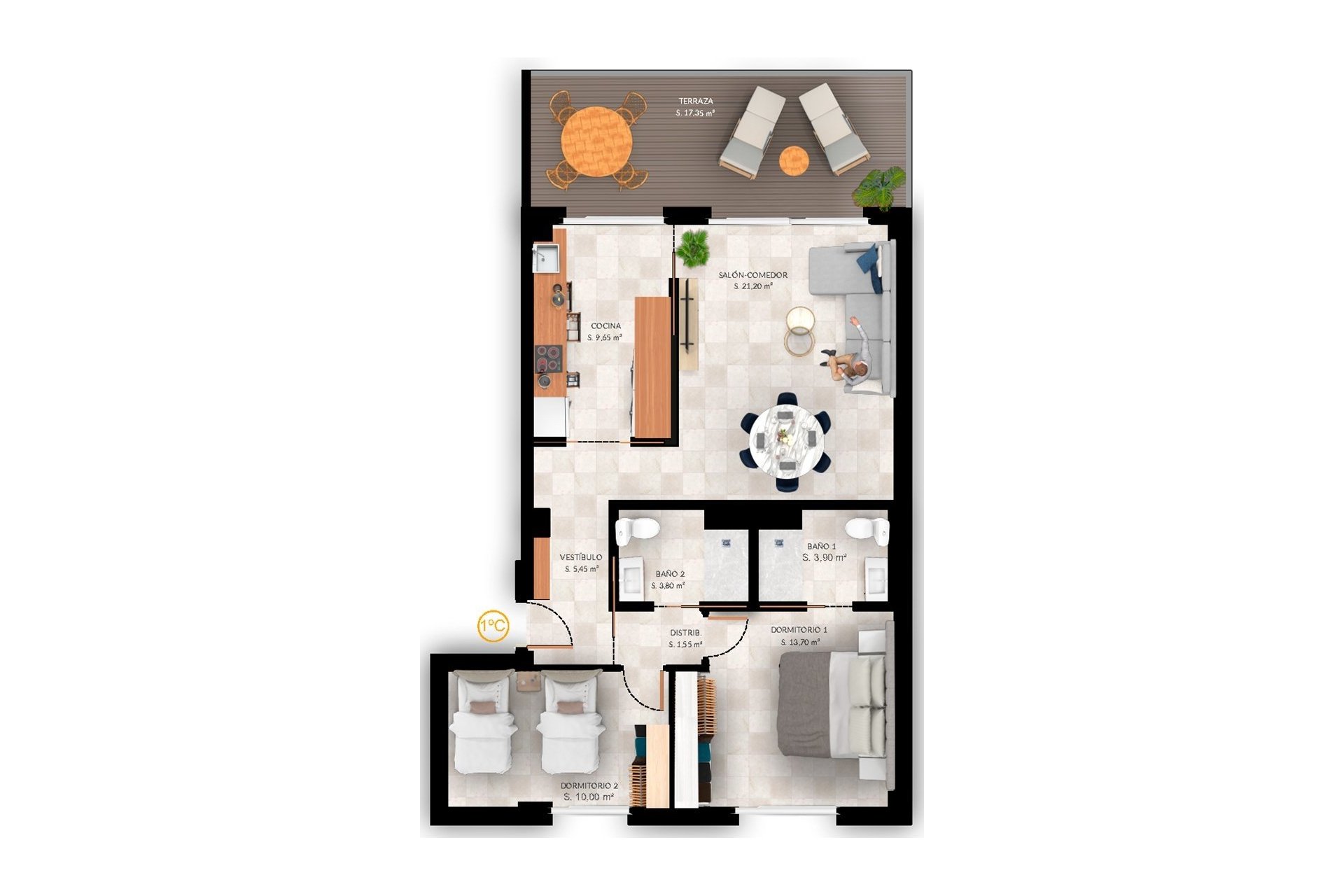 Designed to maximize comfort, each apartment features two bedrooms and two modern bathrooms. The interiors stand out for their exceptional quality, with porcelain tile floors that provide elegance and durability.