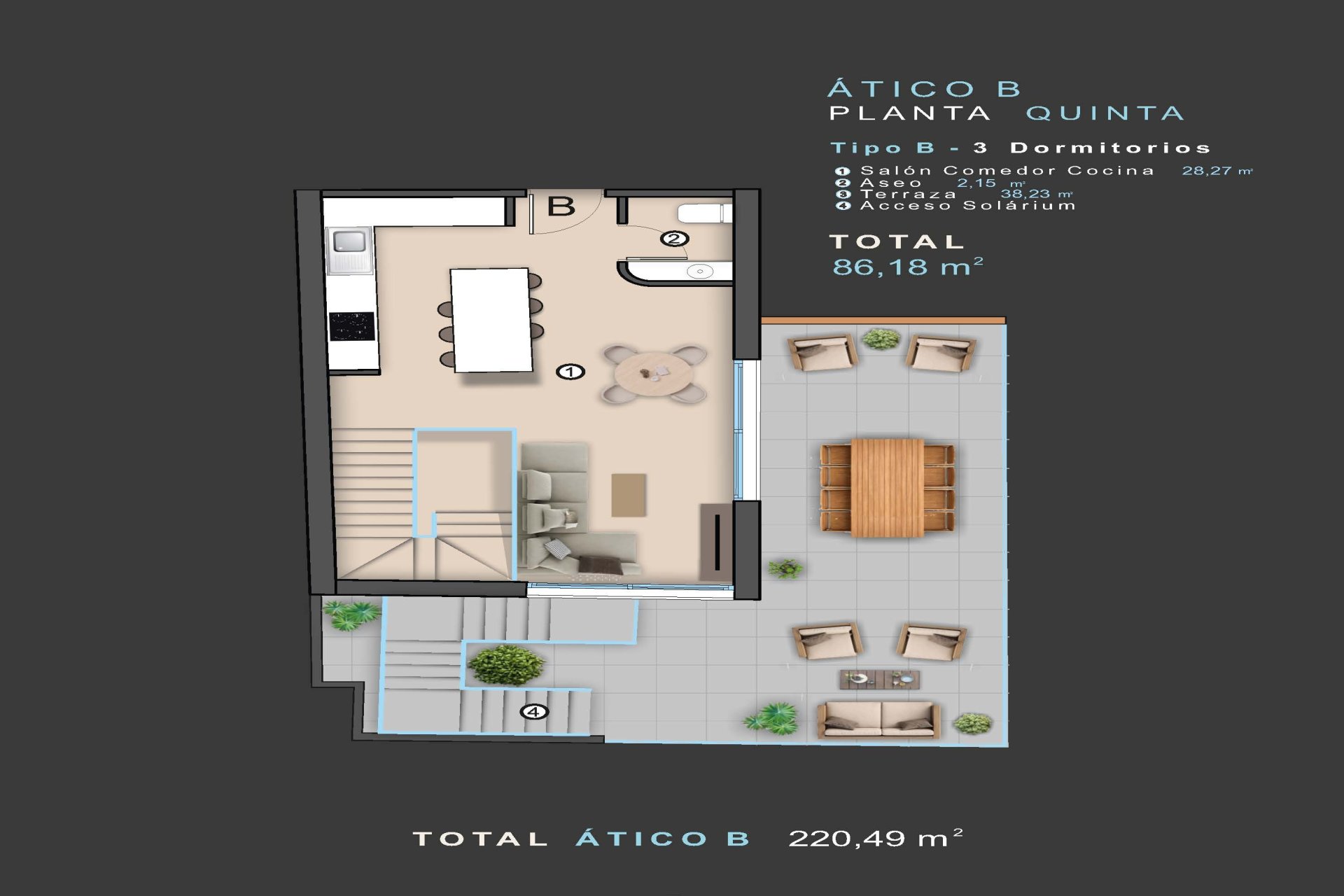 The private solarium is an additional space to enjoy the sun of the Costa Blanca. This place is perfect for creating a relaxing corner or an area to share with friends and family. The private pool ensures unmatched moments of fun and relaxation, being one of the main attractions of these properties.